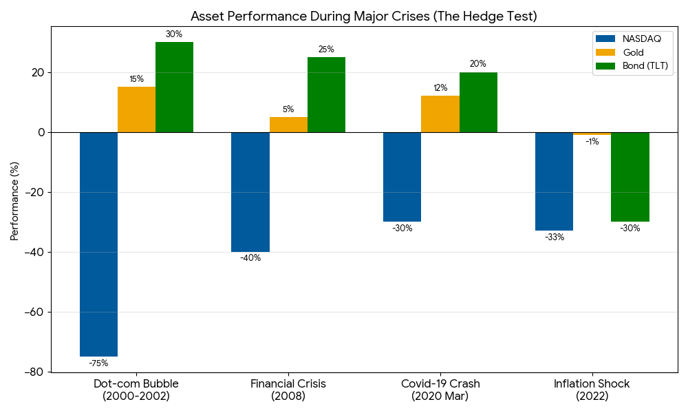 - 금 (노란색): 나스닥이 무너질 때마다 묵묵히 우상향했습니다. 특히 2000년대 초반과 2020년 이후 급등하며 자산 가치를 방어했습니다. 하지만 2022년에는 나스닥 하락 시에 동반하락 하는 모습을 보여줬습니다.