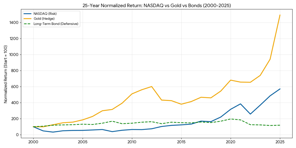 [그래프 1: 나스닥 vs 금 vs 채권 25년 수익률 비교]